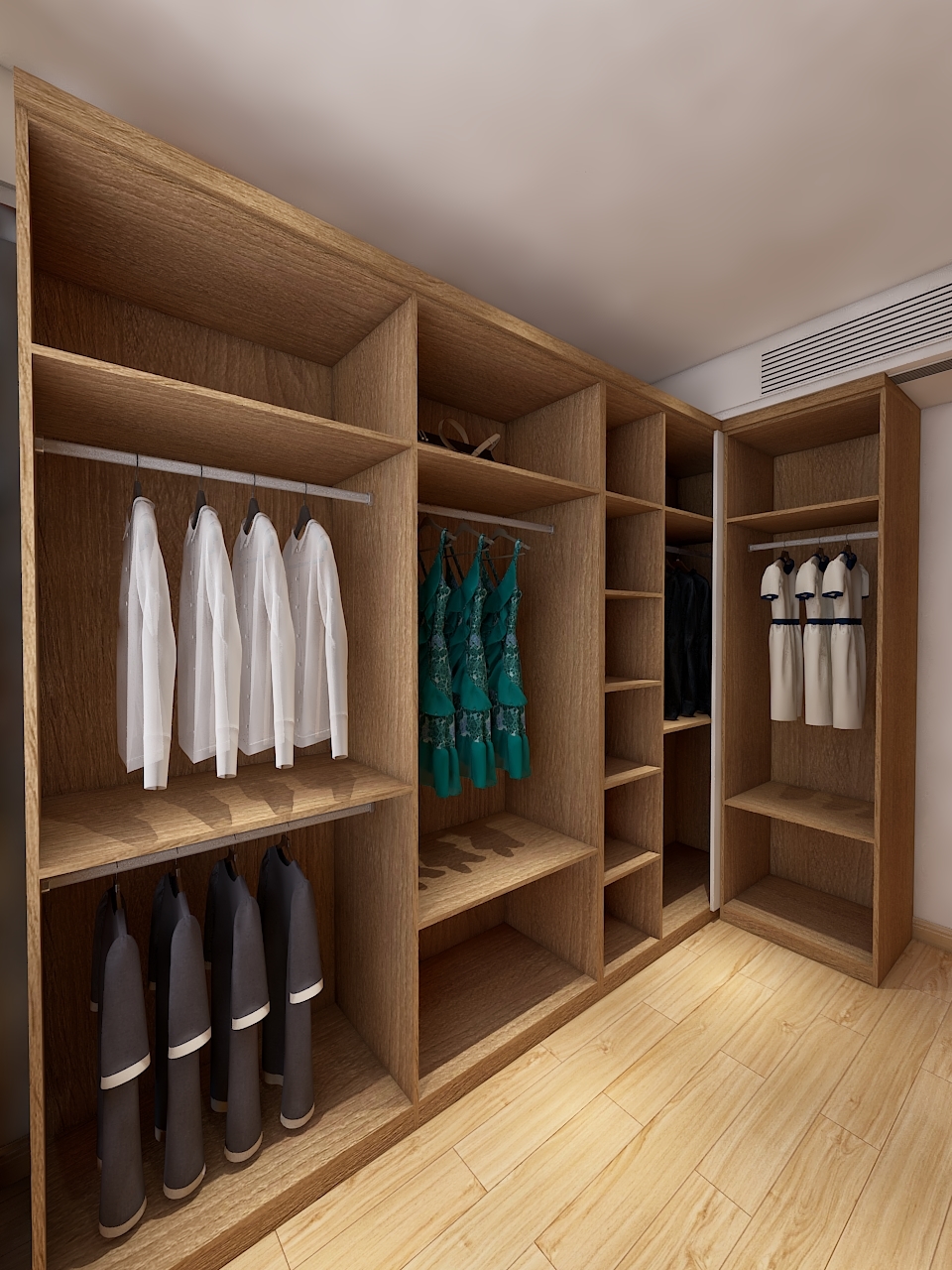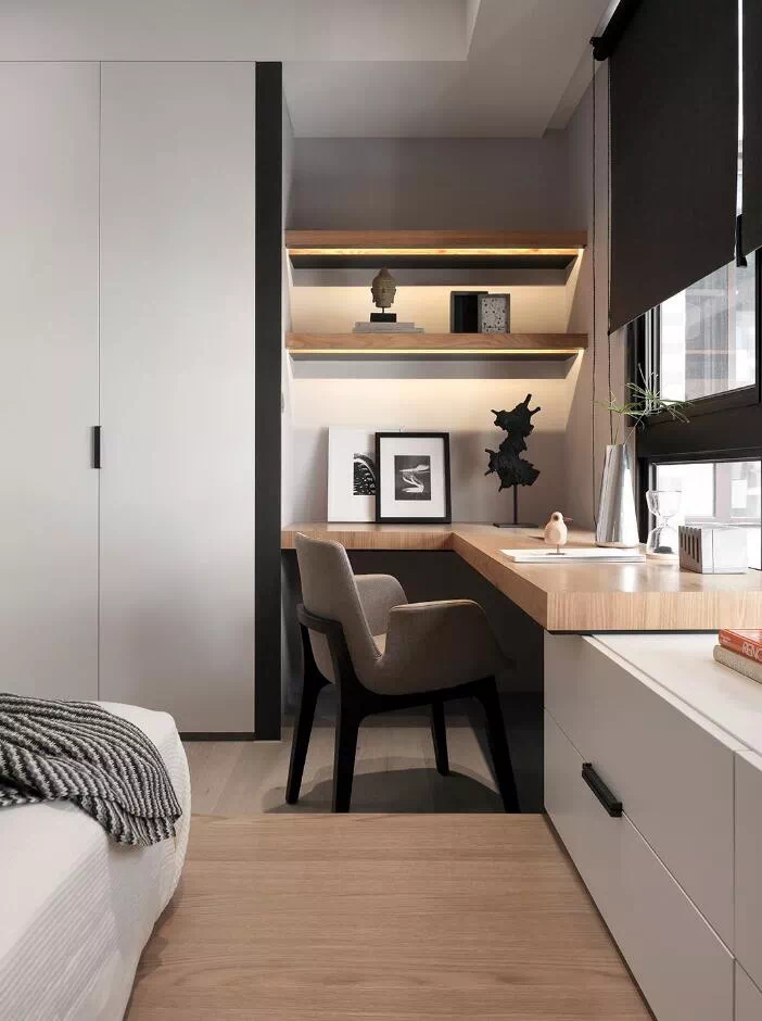 利用臥室的轉(zhuǎn)角位,打造一個(gè)L型衣帽間,而且最好選在進(jìn)門處或者浴室外,避免一眼就看見床,除了收納儲(chǔ)物,還起到隔斷的作用。