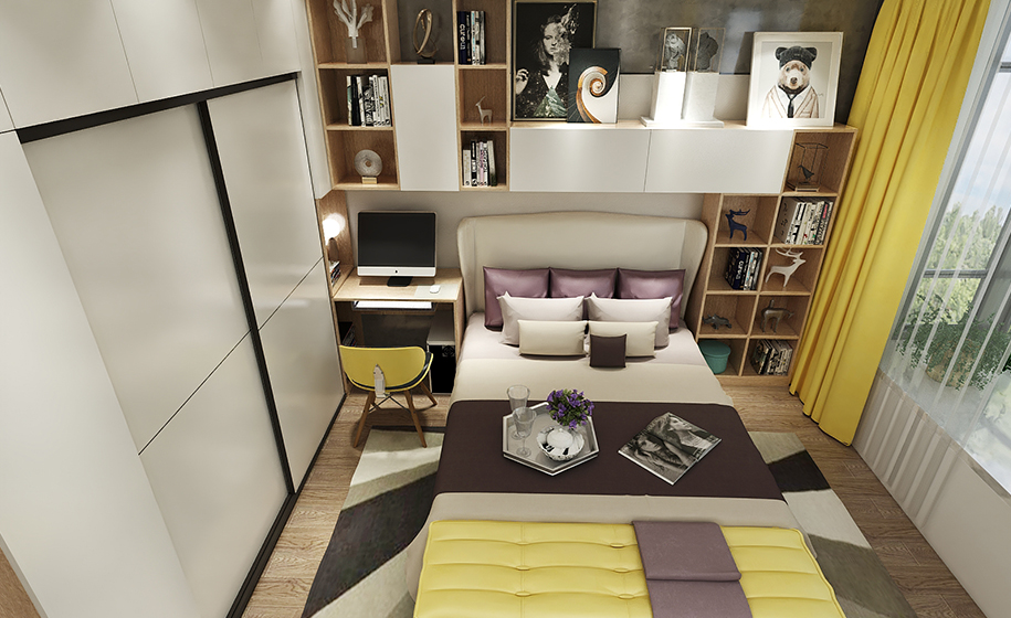 床頭為內(nèi)嵌設(shè)計,凸出來的地方設(shè)計成了吊柜和儲物格,舍棄床頭柜改成書桌(也可做梳妝臺)加上開放格,極大的節(jié)省了空間,也起到很好的裝飾作用。