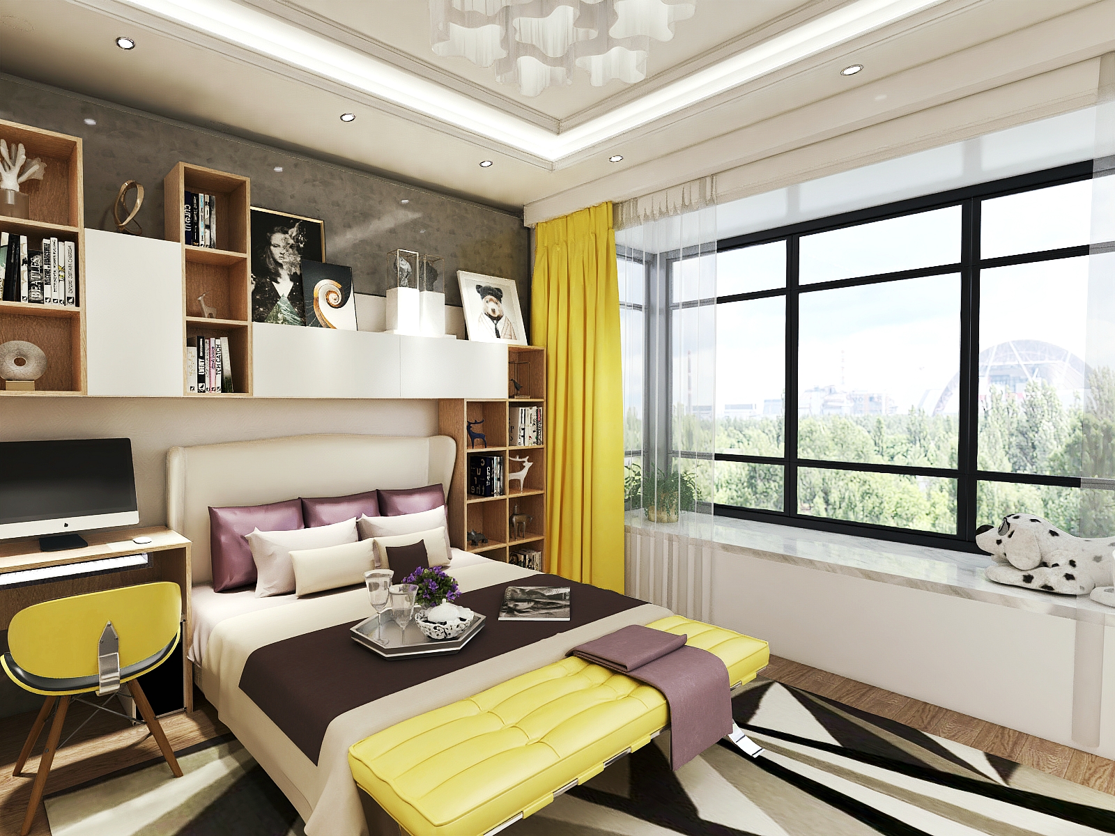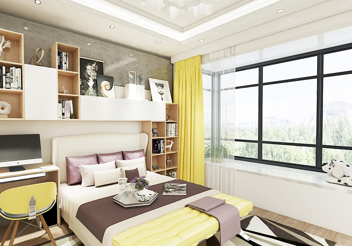 房內(nèi)飄窗以隱匿收納功能為主的窗臺設(shè)計,白色的窗紗,黃色的窗簾與原木色形成視覺上的沖擊力,使整個空間格局層次感更加豐富而又清新舒適。