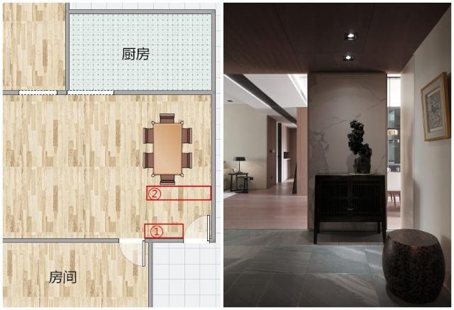 ▲這個長條戶型,其中一個房間可能是客、餐廳,這個大門的左右都是動線,玄關(guān)可放在圖示2個位置,方案②如右圖。