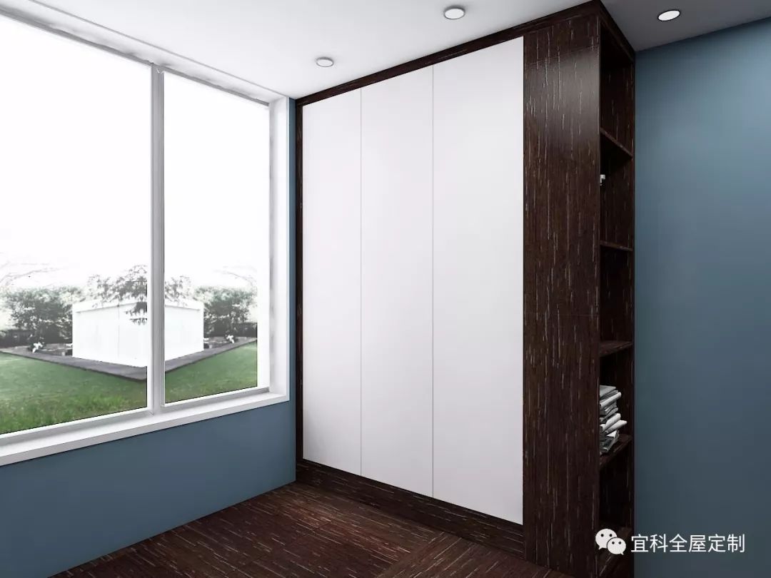 左右對稱的印尼布紋柜門設(shè)計,營造出了很好的視覺效果。而中間通透的玻璃門設(shè)計,則弱化了逼仄空間帶來的壓抑感。三扇柜門,開門方式均為彈開式設(shè)計,快速利落的完成開柜、換衣系列動作。一側(cè)墻面上的藝術(shù)掛畫,在匆忙換衣間隙,余光斜瞄幾眼,頓時讓一天的心情愉悅不少!