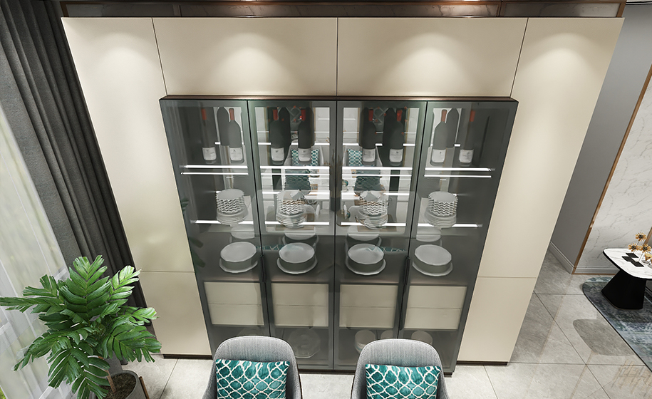 精巧的置物格,等分排列,給予人圓滿與諧和之美。黑的沉穩(wěn)、啡的高雅配上質(zhì)感的玻璃柜門,讓單調(diào)的餐廳變得不僅顏值爆棚,還生動有情調(diào)。