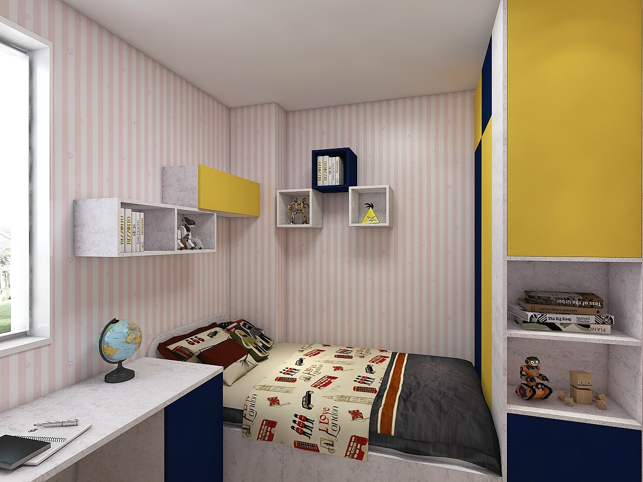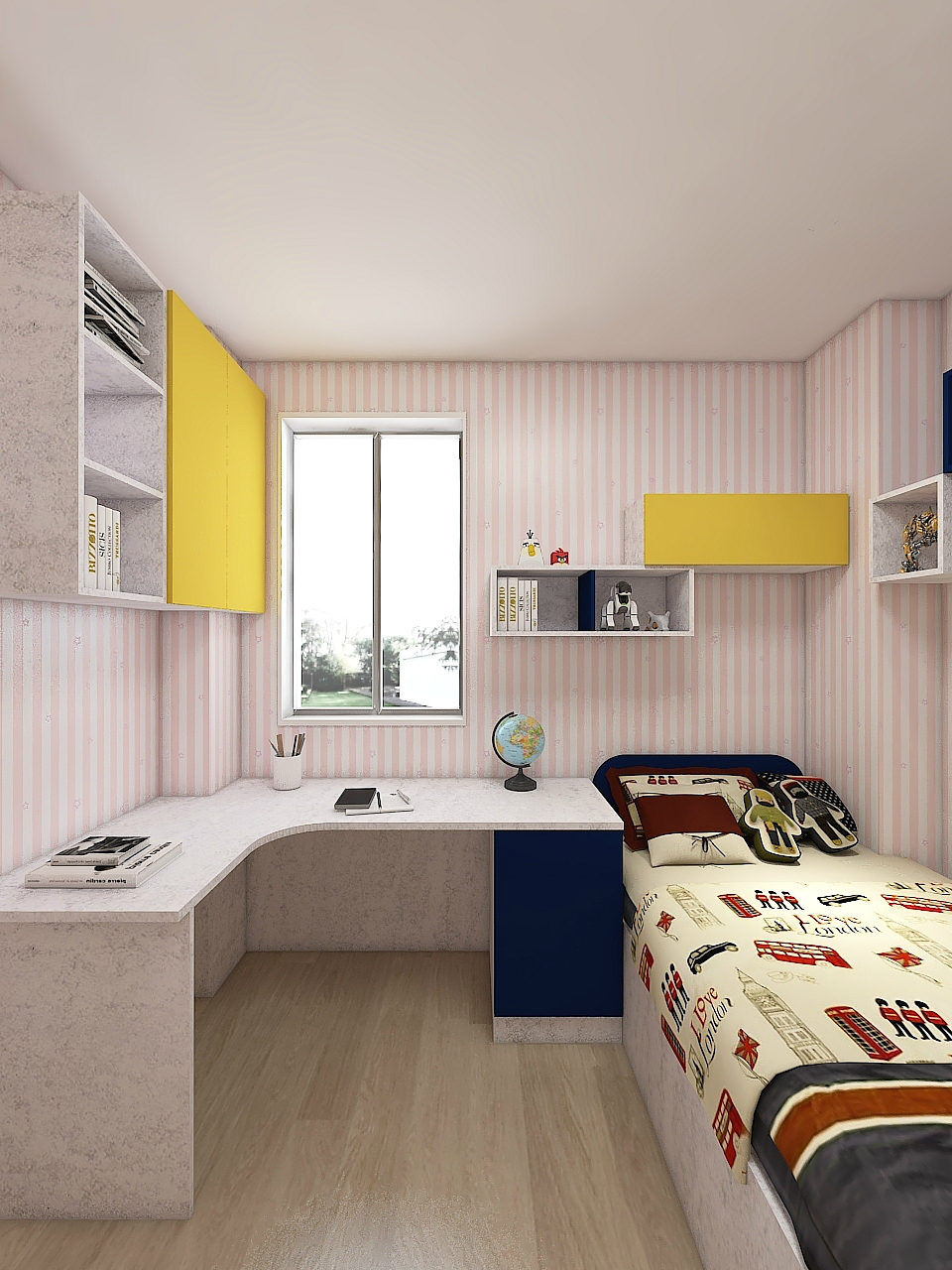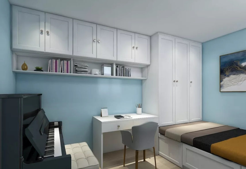 孩子的房間,學(xué)習(xí)環(huán)境至關(guān)重要,不是隨便的一桌一椅就能簡單應(yīng)付的。依墻而設(shè)的L型書桌,將傳統(tǒng)的桌柜一體的設(shè)計簡化成吧臺式。既完美利用了邊角死區(qū),又不會給人空間上的壓抑感。
